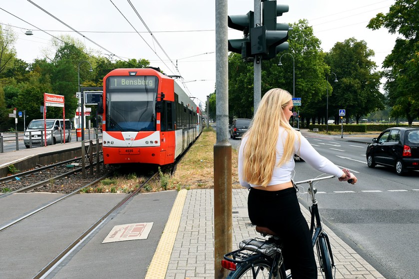 KVB tram 4535 + tram 4527 – Universitätsstraße – Colonia (D) – 18 agosto 2022 – (non sempre i ciclisti disturbano l’immagine)